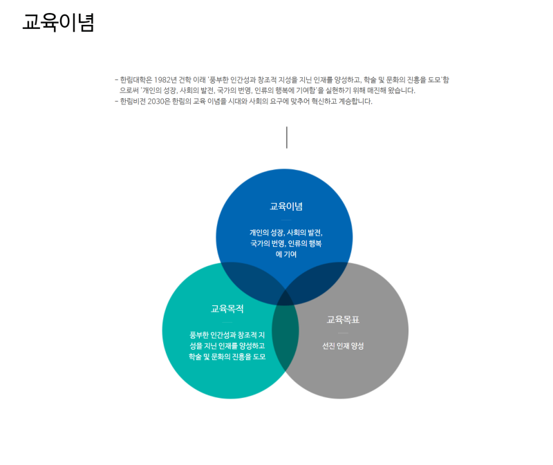 한림대학교는 ‘창의, 인성, 봉사‘를 핵심 가치로 삼으며, 4차 산업혁명 시대를 선도하는 융합형 인재 양성을 목표로 합니다. 특히 의료, IT, 바이오, 인문사회과학 분야의 강점을 기반으로 학문 간 경계를 허무는 융합 교육을 적극 추진하고 있습니다. 다양한 국책사업과 산학협력 프로젝트를 통해 학생들에게 실질적인 경험과 연구 기회를 제공하며, 글로벌 인재 양성을 위한 국제 교류 프로그램도 활발하게 운영하고 있습니다.
